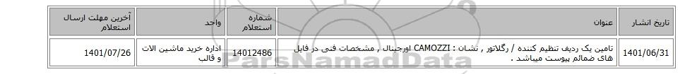 | 1401/06/31 | تامین یک ردیف تنظیم کننده / رگلاتور , نشان : CAMOZZI اورجینال , مشخصات فنی در فایل های ضمائم پیوست میباشد . | 14012486 | اداره خرید ماشین الات و قالب | 1401/07/26 |
