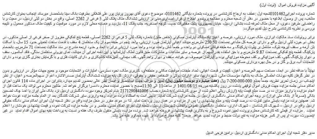 نهایتاً با مداقه نظر در ابعاد، مساحت سهم العرصه و اعیان، کیفیت و قدمت اعیانی، تعداد طبقات، موقعیت مکانی و منطقهای، کاربری ملک، نحوه دسترسی، امتیازات و انشعابات موجود و جمیع جهات مؤثر در ارزیابی و بدون در نظر گرفتن کلیه دیونات احتمالی ملک به بانکها، مؤسسات مالی، شهرداریها، سایر ادارات دولتی و اشخاص حقیقی و حقوقی، ارزش کل پایه مزایده ششدانگ آپارتمان صدرالاشاره اعم از سهمالعرصه و اعیان، از نظر اینجانب در زمان تحریر نظریه، جمعاً بمبلغ 7،200،000،000 ریال (هفت میلیارد و دویست میلیون ریال) تعیین و مراتب جهت استحضار و امعان نظر عالی بحضور تقدیم میدارد.بنابراین در اجرای ماده 114 قانون اجرای احکام مدنی جلسه مزایده جهت فروش اموال توقیفی یادشده در روز یکشنبه مورخه 1401/08/15 از ساعت11 الی 11:30صبح با حضور نماینده محترم دادسرا برگزار خواهد شد. طالبین محترم می توانند یک ساعت قبل از انجام مزایده با واریز میزان ده در صد مبلغ قیمت پایه (ارزش ریالی اعلام شده از سوی کارشناس) به شماره حساب 2171290841006 بنام تمرکز وجوه سپرده دادگستری اردبیل نزد بانک ملی ایران یا اخذ چک تضمین بانکی (صرفاً از بانک ملی ایران) در وجه اجرای احکام مدنی دادگستری اردبیل در جلسه مزایده شرکت نمایند. بدیهی است به استثناء برنده مزایده، وجه واریزی سایر شرکت کنندگان بعد از اتمام جلسه مزایده عودت خواهد شد. همچنین برنده مزایده بایستی مابین تفاوت ده درصد قیمت پایه و مبلغ پیشنهادی را پس از مزایده و در همان روز پرداخت نماید. لذا در موعد مقرر در محل مزایده واقع در دفتر شعبه اول اجرای احکام مدنی دادگاه حقوقی اردبیل واقع در اردبیل – شهرک کارشناسان - شهرک اداری- ساختمان دادگاههای عمومی وانقلاب شهرستان اردبیل - شعبه اول اجرای احکام مدنی، حاضر و در جلسه مزایده شرکت نموده و قیمت پیشنهادی خودشان را اعلام نمایند . مزایده از قیمتی که کارشناس محترم پرونده تعیین نموده شروع و به بالاترین قیمت پیشنهادی فروخته خواهد شد. برنده مزایده بایستی منقول ظرف یک هفته و نسبت به پرداخت بقیه بهای اموال اقدام نماید در غیر اینصورت، سپرده او پس از کسر هزینه مزایده به نفع دولت ضبط و مزایده تجدید خواهد. ضمنا" کلیه مخارج مزایده بر عهده محکوم علیه می باشد.
