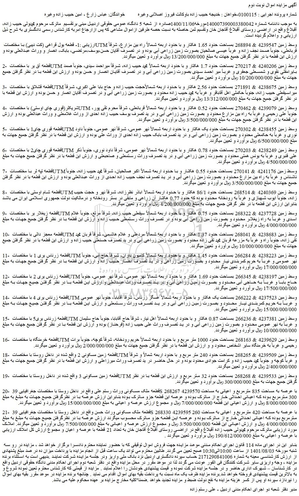 شماره پرونده اجرایی : 0100115،خواهان : خدیجه حبیب زاده باوکالت فیروز اصلانی وغیره خواندگان: عباس زارع ، امین حبیب زاده وغیره