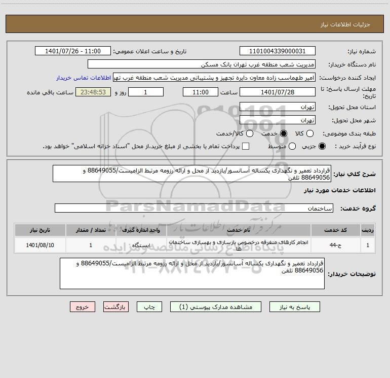 شرح کلی نیاز: قرارداد تعمیر و نگهداری یکساله آسانسور/بازدید از محل و ارائه رزومه مرتبط الزامیست/88649055 و 88649056 تلفن