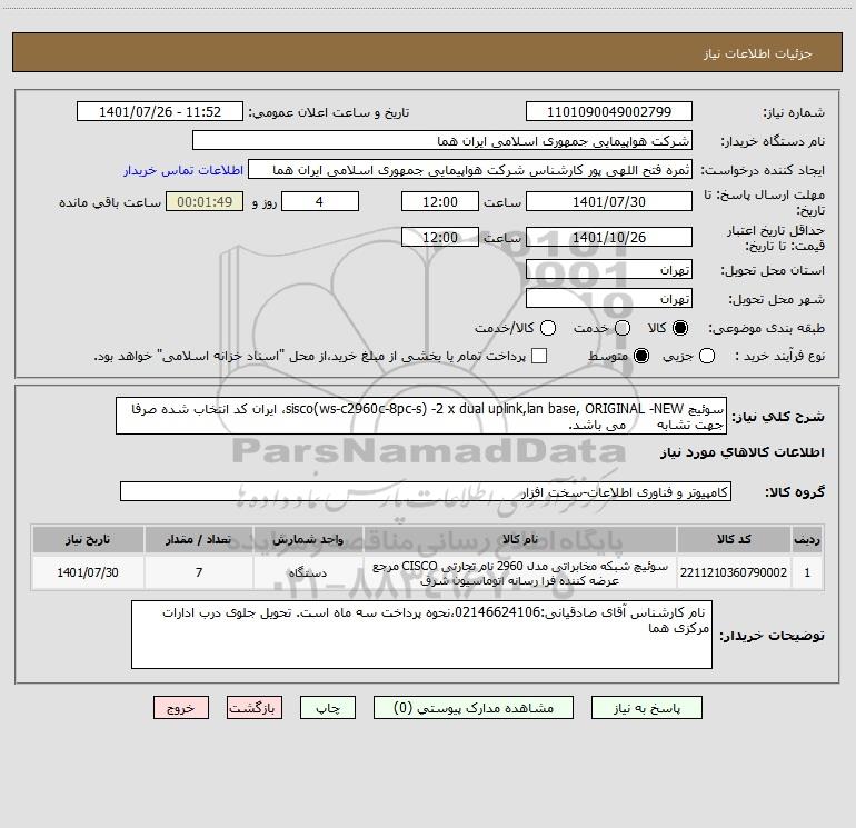 شرح کلی نیاز: سوئیچ sisco(ws-c2960c-8pc-s) -2 x dual uplink,lan base, ORIGINAL -NEW، ایران کد انتخاب شده صرفا جهت تشابه می باشد.