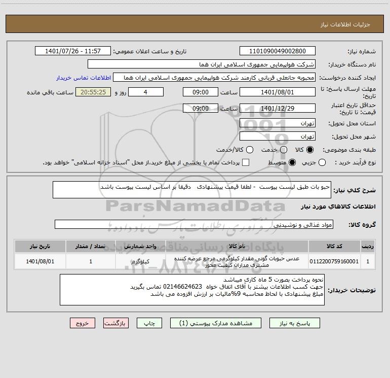 شرح کلی نیاز: حبو بات طبق لیست پیوست - لطفا قیمت پیشنهادی دقیقا بر اساس لیست پیوست باشد