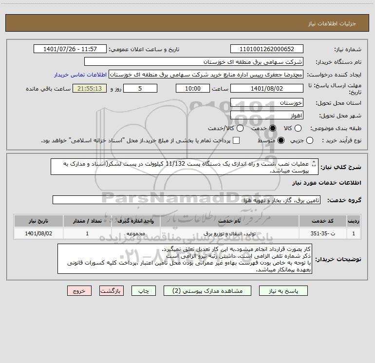 شرح کلی نیاز: عملیات نصب ،تست و راه اندازی یک دستگاه پست 11/132 کیلوولت در پست لشکر(اسناد و مدارک به پیوست میباشد.