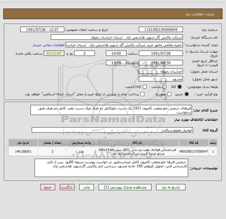 نام دستگاه خریدار:شرکت پالایش گاز شهید هاشمی نژاد استان خراسان رضوی