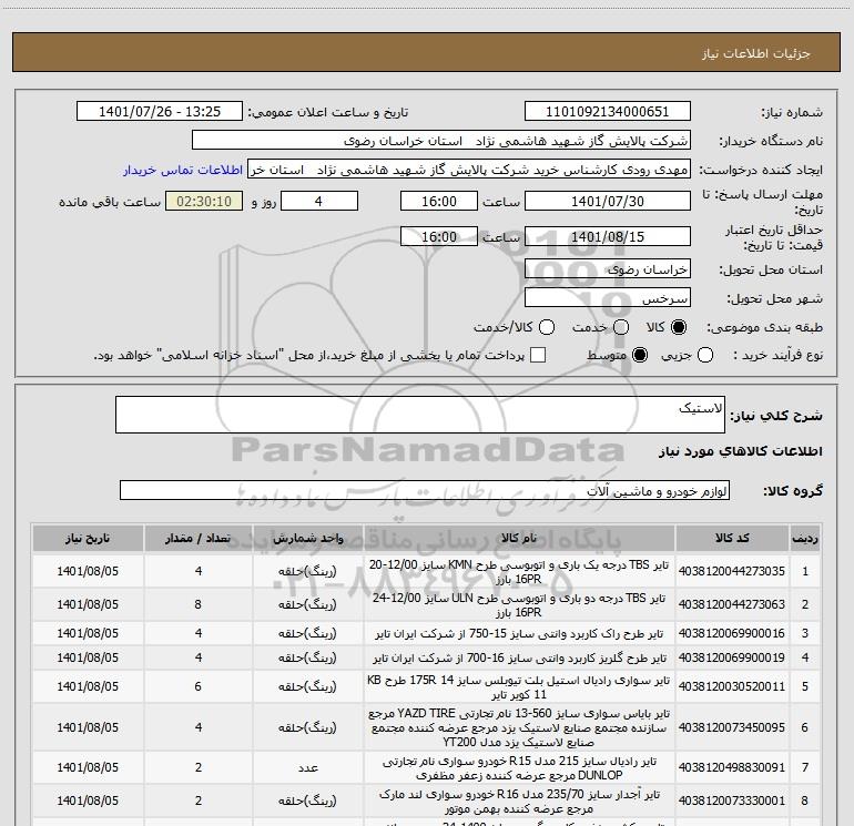 نام دستگاه خریدار:شرکت پالایش گاز شهید هاشمی نژاد استان خراسان رضوی