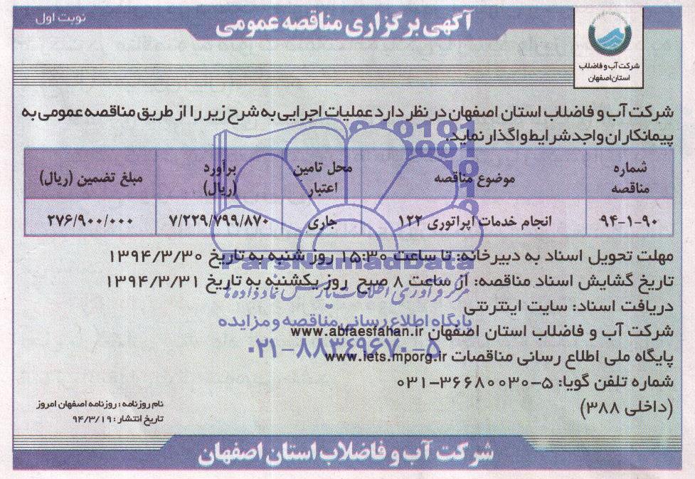 مناقصه انجام خدمات اپراتوری 122, آگهی برگزاری مناقصه عمومی, مناقصه انجام خدمات اپراتوری 122