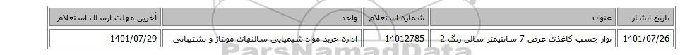 | 1401/07/26 | نوار چسب کاغذی عرض 7 سانتیمتر سالن رنگ 2 | 14012785 | اداره خرید مواد شیمیایی سالنهای مونتاژ و پشتیبانی | 1401/07/29 |