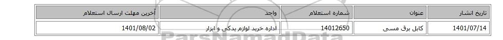 | 1401/07/14 | کابل برق مسی | 14012650 | اداره خرید لوازم یدکی و ابزار | 1401/08/02 |