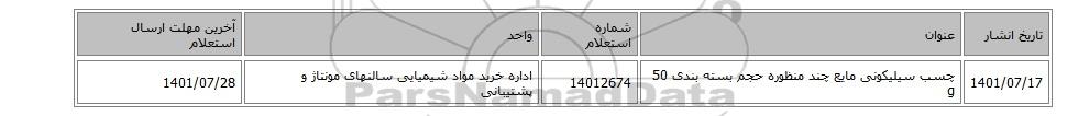 | 1401/07/17 | چسب سیلیکونی مایع چند منظوره حجم بسته بندی 50 g | 14012674 | اداره خرید مواد شیمیایی سالنهای مونتاژ و پشتیبانی | 1401/07/28 |