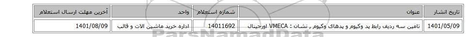 استعلام بها و موضوع استعلام تامین سه ردیف رابط پد وکیوم و پدهای وکیوم , نشان : VMECA اورجینال به اطلاع کلیه شرکتها و افراد متخصص واجد شرایط میرساند، آگهی گذار در نظر دارد از طریق استعلام بها، نسبت به انتخاب و دریافت پیشنهادات اقدام نماید. این استعلام با کد آگهی ثبت شده در سامانه خبرگزاری پارس نماد : 5044988 منتشر شده است. مشخصات استعلام : تاریخ شروع استعلام: 1401/07/27 آخرین مهلت ارسال پیشنهاد قیمت : 1401/08/09 و محل اجرای پروژه : استان تهران میباشد. استعلام قیمت مورد درخواست : تامین سه ردیف رابط پد وکیوم و پدهای وکیوم , نشان : VMECA اورجینال با دستهبندیهای تخصصی و گروه های مرتبط : الکتروموتور و پمپ های شناور, تجهیزات و ماشین آلات صنعتی, قطعات خودرو, استعلام اطلاع رسانی میگردد.