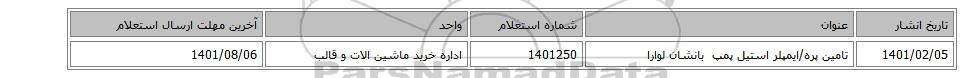 | 1401/02/05 | تامین پره/ایمپلر استیل پمپ بانشان لوارا | 1401250 | اداره خرید ماشین الات و قالب | 1401/08/06 |