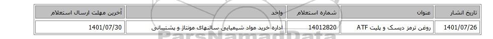 | 1401/07/26 | روغن ترمز دیسک و پلیت ATF | 14012820 | اداره خرید مواد شیمیایی سالنهای مونتاژ و پشتیبانی | 1401/07/30 |