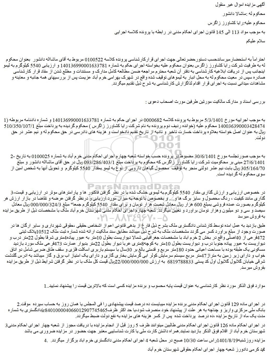 2- به موجب صورتجلسه مورخ 30/6/1401 مضبوط در پرونده حسب خواسته شعبه چهارم اجرای احکام مدنی خرم آباد به شماره 0100025 به تاریخ 27/6/1401 مبنی بر محکومیت شرکت رایا کشاورز زاگرس که محکوم به پرداخت مبلغ 093/286/403/1 ریال در حق آقای ماشااله دانشور و مبلغ 305/164/70 ریال بابت نیم عشر دولتی منجر به توقیف محصول گیاهان دارویی از نوع به لیمو بمقدار 5540 کیلوگرم و تحویل آنها به شخص امین از سوی محکوم له گردیده است.