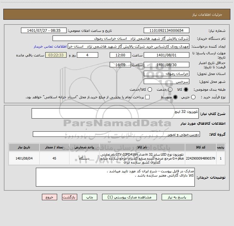 نام دستگاه خریدار:شرکت پالایش گاز شهید هاشمی نژاد استان خراسان رضوی
