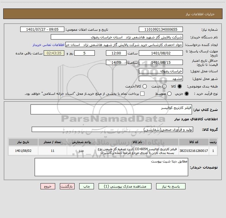 نام دستگاه خریدار:شرکت پالایش گاز شهید هاشمی نژاد استان خراسان رضوی