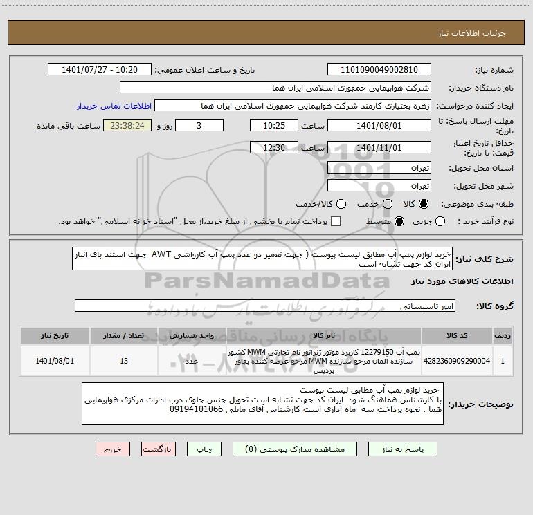 توضیحات خریدار: خرید لوازم پمپ آب مطابق لیست پیوست با کارشناس هماهنگ شود ایران کد جهت تشابه است تحویل جنس جلوی درب ادارات مرکزی هواپیمایی هما . نحوه پرداخت سه ماه اداری است کارشناس آقای مایلی 09194101066