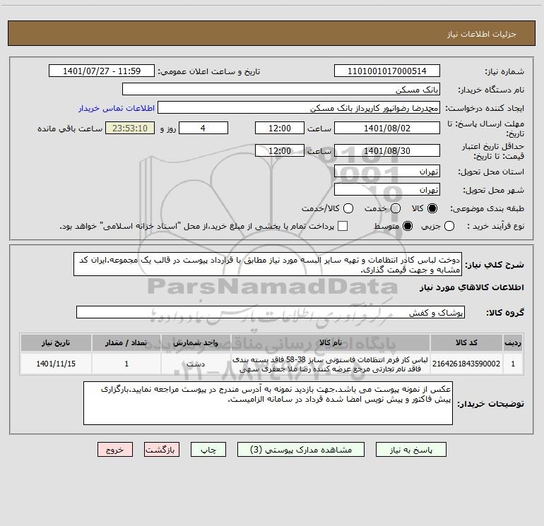 شرح کلی نیاز: دوخت لباس کادر انتظامات و تهیه سایر البسه مورد نیاز مطابق با قرارداد پیوست در قالب یک مجموعه.ایران کد مشابه و جهت قیمت گذاری.