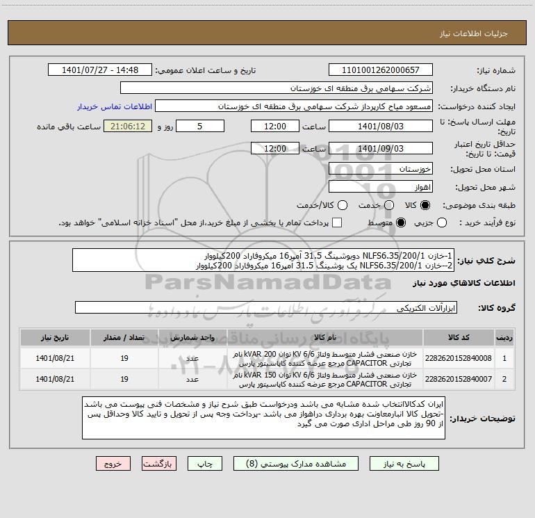 شرح کلی نیاز: 1-خازن NLFS6.35/200/1 دوبوشینگ 31.5 آمپر16 میکروفاراد 200کیلووار 2--خازن NLFS6.35/200/1 یک بوشینگ 31.5 آمپر16 میکروفاراد 200کیلووار