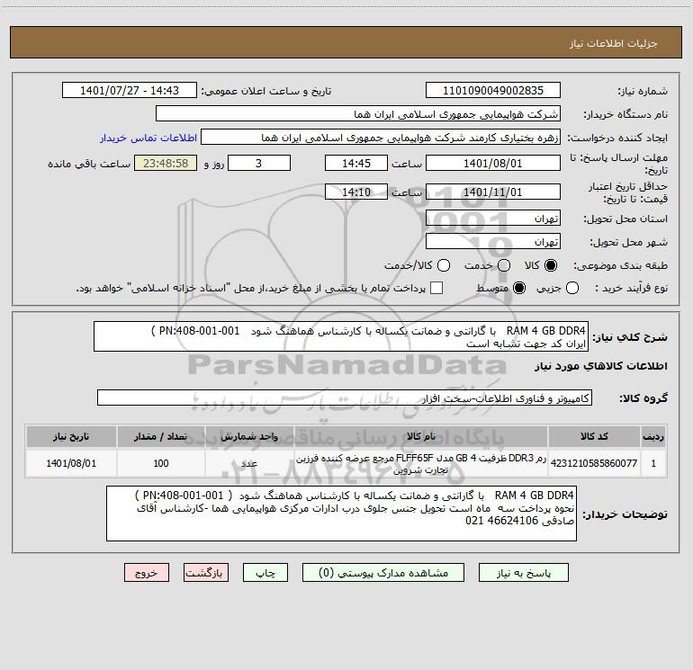 استعلام RAM 4 GB DDR4 با گارانتی و ضمانت یکساله با کارشناس هماهنگ شود PN:408-001-001 ) ایران کد جهت تشابه است, استعلام RAM 4 GB DDR4 با گارانتی و ضمانت یکساله با کارشناس هماهنگ شود PN:408-001-001 ) ایران کد جهت تشابه است