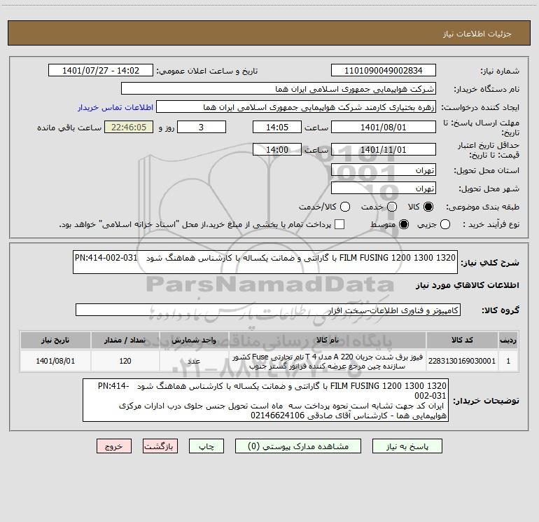 شرح کلی نیاز: FILM FUSING 1200 1300 1320 با گارانتی و ضمانت یکساله با کارشناس هماهنگ شود PN:414-002-031