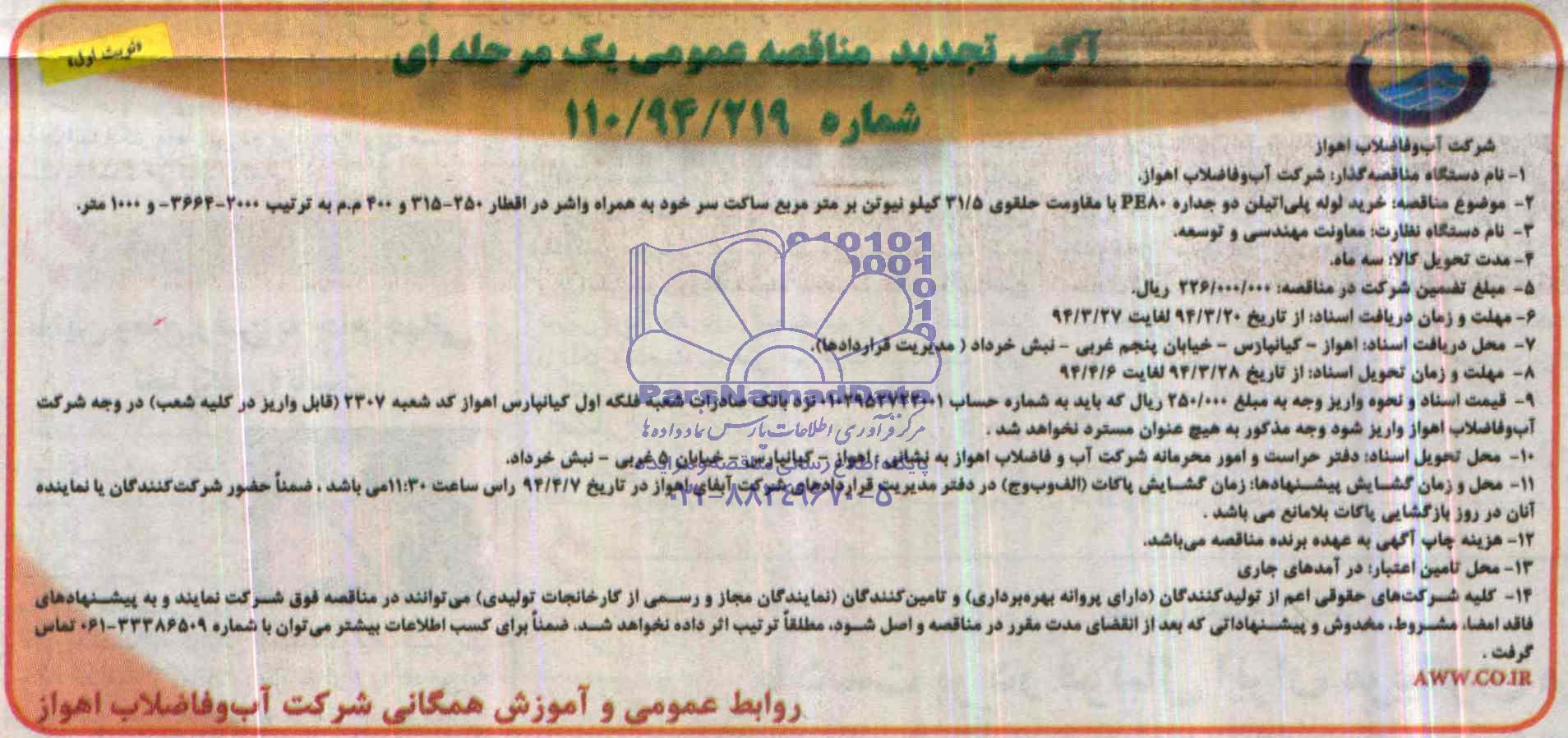 نام دستگاه مناقصه گزار: شرکت آب و فاضلاب اهواز