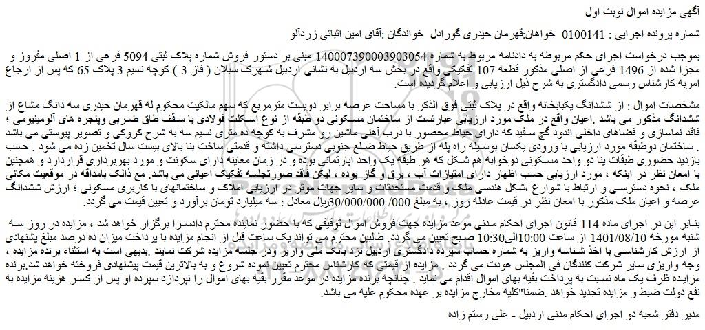 بموجب درخواست اجرای حکم مربوطه به دادنامه مربوط به شماره 140007390003903054 مبنی بر دستور فروش شماره پلاک ثبتی 5094 فرعی از 1 اصلی مفروز و مجزا شده از 1496 فرعی از اصلی مذکور قطعه 107 تفکیکی واقع در بخش سه اردبیل به نشانی اردبیل شهرک سبلان ( فاز 3 ) کوچه نسیم 3 پلاک 65 که پس از ارجاع امربه کارشناس رسمی دادگستری به شرح ذیل ارزیابی و اعلام گردیده است.