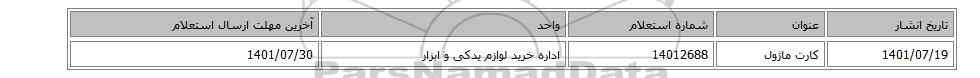 | 1401/07/19 | کارت ماژول | 14012688 | اداره خرید لوازم یدکی و ابزار | 1401/07/30 |