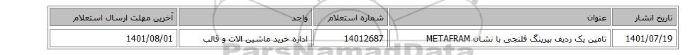 1401/07/19تامین یک ردیف بیرینگ فلنجی با نشان METAFRAM14012687اداره خرید ماشین الات و قالب1401/08/01