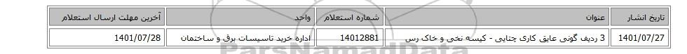 | 1401/07/27 | 3 ردیف گونی عایق کاری چتایی - کیسه نخی و خاک رس | 14012881 | اداره خرید تاسیسات برق و ساختمان | 1401/07/28 |