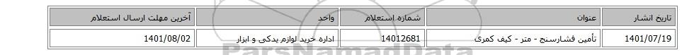 | 1401/07/19 | تأمین فشارسنج - متر - کیف کمری | 14012681 | اداره خرید لوازم یدکی و ابزار | 1401/08/02 |