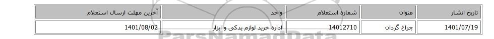 | 1401/07/19 | چراغ گردان | 14012710 | اداره خرید لوازم یدکی و ابزار | 1401/08/02 |
