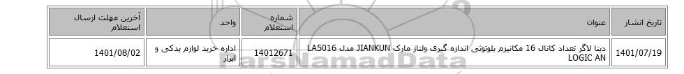 | 1401/07/19 | دیتا لاگر تعداد کانال 16 مکانیزم بلوتوثی اندازه گیری ولتاژ مارک JIANKUN مدل LA5016 LOGIC AN | 14012671 | اداره خرید لوازم یدکی و ابزار | 1401/08/02 |