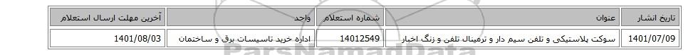 | 1401/07/09 | سوکت پلاستیکی و تلفن سیم دار و ترمینال تلفن و زنگ اخبار | 14012549 | اداره خرید تاسیسات برق و ساختمان | 1401/08/03 |