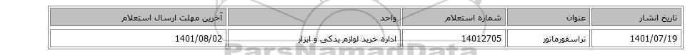 | 1401/07/19 | تراسفورماتور | 14012705 | اداره خرید لوازم یدکی و ابزار | 1401/08/02 |