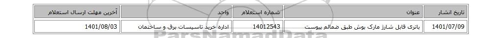 | 1401/07/09 | باتری قابل شارژ مارک بوش طبق ضمائم پیوست | 14012543 | اداره خرید تاسیسات برق و ساختمان | 1401/08/03 |