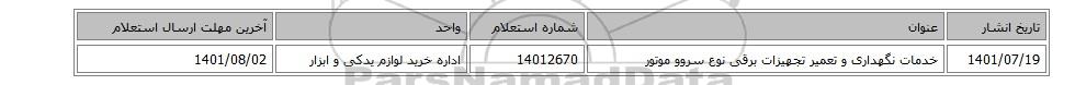 | 1401/07/19 | خدمات نگهداری و تعمیر تجهیزات برقی نوع سروو موتور | 14012670 | اداره خرید لوازم یدکی و ابزار | 1401/08/02 |