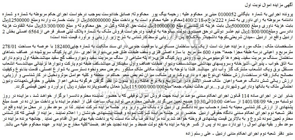پرونده اجرایی به شماره بایگانی 0100052 مبنی بر محکوم علیه : رحیمه بیگ پور محکوم له: صادق خدادوست بموجب درخواست اجرای حکم مربوطه به شماره و شماره دادنامه مربوطه به رای داوری به شماره 222/م/ع/م-1400/2/18محکوم علیه محکوم است به پرداخت مبلغ 360000000ریال از بابت خسارت وارده ومبلغ 12500000ریال بابت هزینه داوری ومبلغ 5000000ریال بابت هزینه کارشناسی ومبلغ 10000000ریال بابت حق الوکاله وکیل در حق محکوم له و مبلغ 33/300/000ریال مابه التفاوت هزینه دادرسی ومبلغ1/800/000ریال نیم عشر دولتی درحق صندوق دولت ،باتوجه به توقیف ودرخواست فروش ملک به شماره پلاک ثبتی صفر فرعی از6564 اصلی بخش 2 اردبیل واقع در اردبیل –میدان شریعتی-کوچه داشچیلار-پلاک40 پس از ارزیابی توسط کارشناس به شرح زیر ارزیابی و برآورد قیمت شده است؛