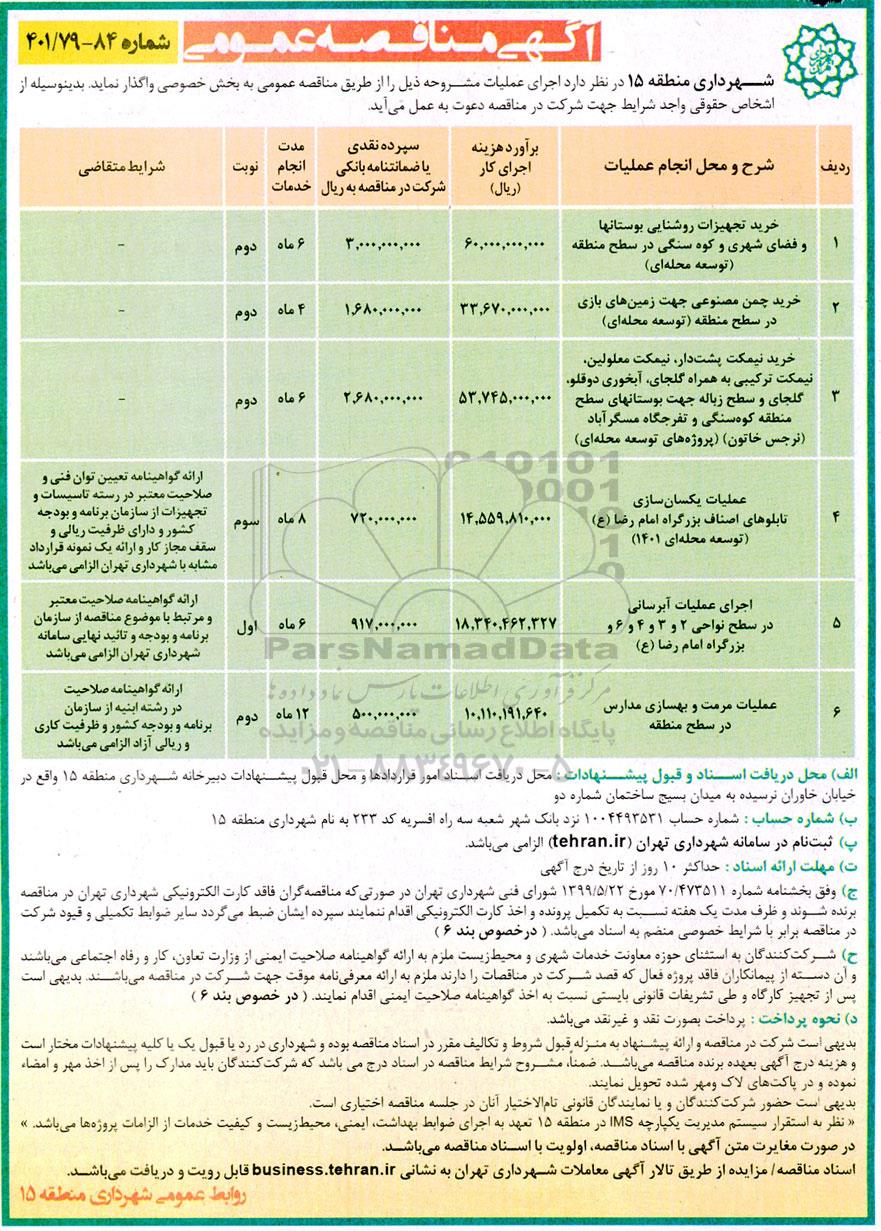 شهرداری منطقه 15 در نظر دارد اجرای عملیات مشروحه ذیل را از طریق مناقصه عمومی به بخش خصوصی واگذار نماید. بدینوسیله از اشخاص حقوقی واجد شرایط جهت شرکت در مناقصه دعوت بعمل می آید
