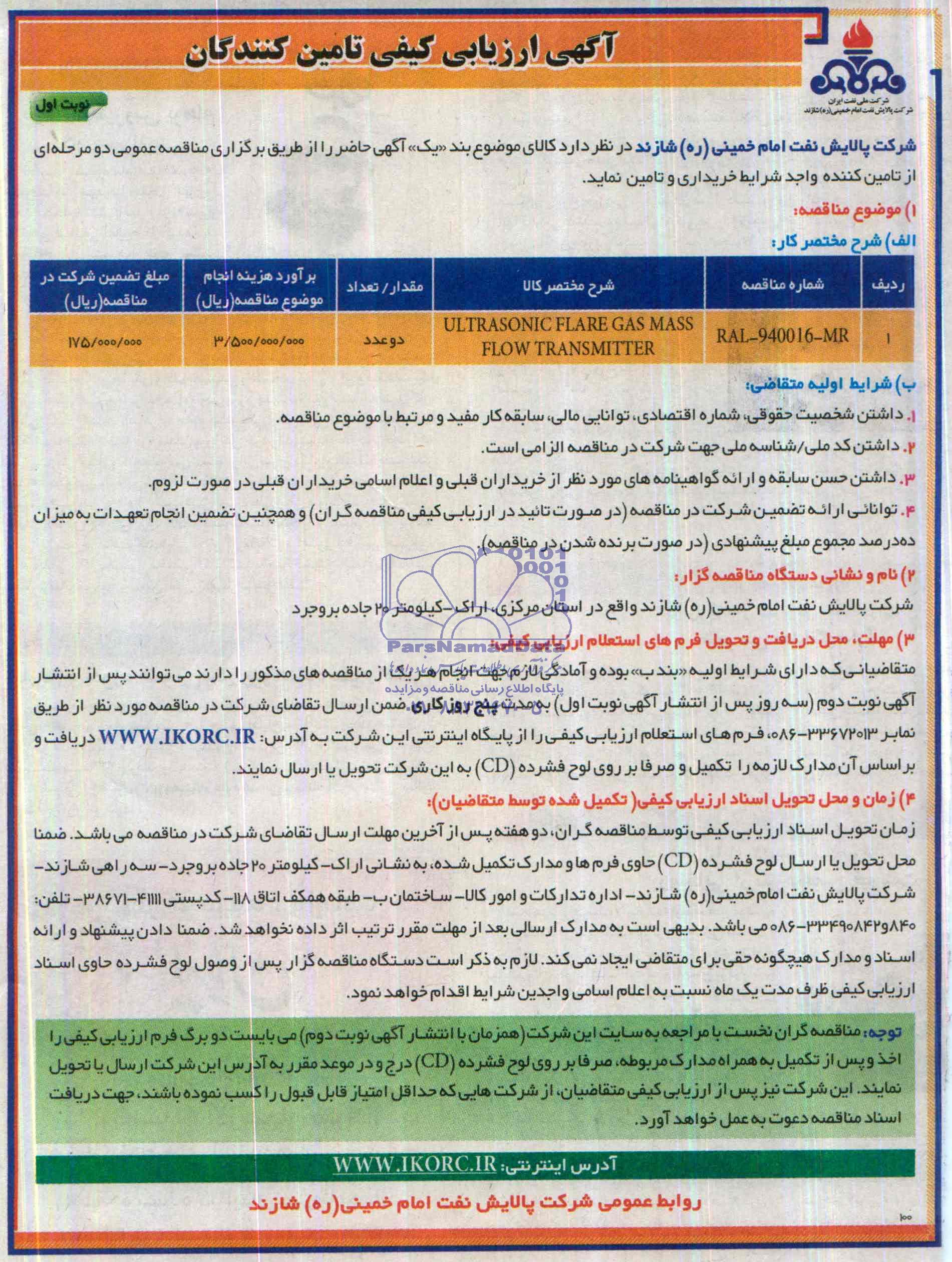 | RAL-940016-MR | ULTRASONIC FLARE GAS MASS FLOW TRAMSMITTER | دو عدد | 3.500.000.000 | 175.000.000 |