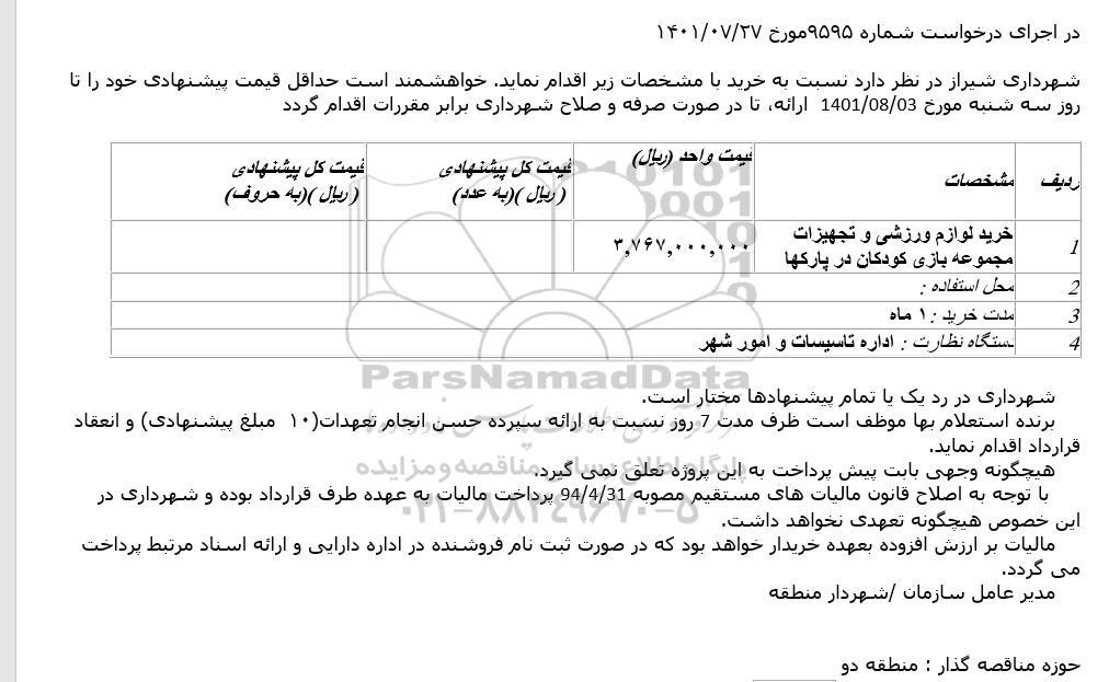 استعلام بها و موضوع استعلام استعلام خرید لوازم ورزشی و تجهیزات مجموعه بازی کودکان در پارکها به اطلاع کلیه شرکتها و افراد متخصص واجد شرایط میرساند، آگهی گذار در نظر دارد از طریق استعلام بها، نسبت به انتخاب و دریافت پیشنهادات اقدام نماید. این استعلام با کد آگهی ثبت شده در سامانه خبرگزاری پارس نماد : 5051085 منتشر شده است. مشخصات استعلام : تاریخ شروع استعلام: 1401/07/28 آخرین مهلت ارسال پیشنهاد قیمت : 1401/08/03 و محل اجرای پروژه : استان فارس میباشد. استعلام قیمت مورد درخواست : استعلام خرید لوازم ورزشی و تجهیزات مجموعه بازی کودکان در پارکها با دستهبندیهای تخصصی و گروه های مرتبط : تجهیزات پارک و مبلمان شهری, تجهیزات ورزشی, استعلام اطلاع رسانی میگردد.