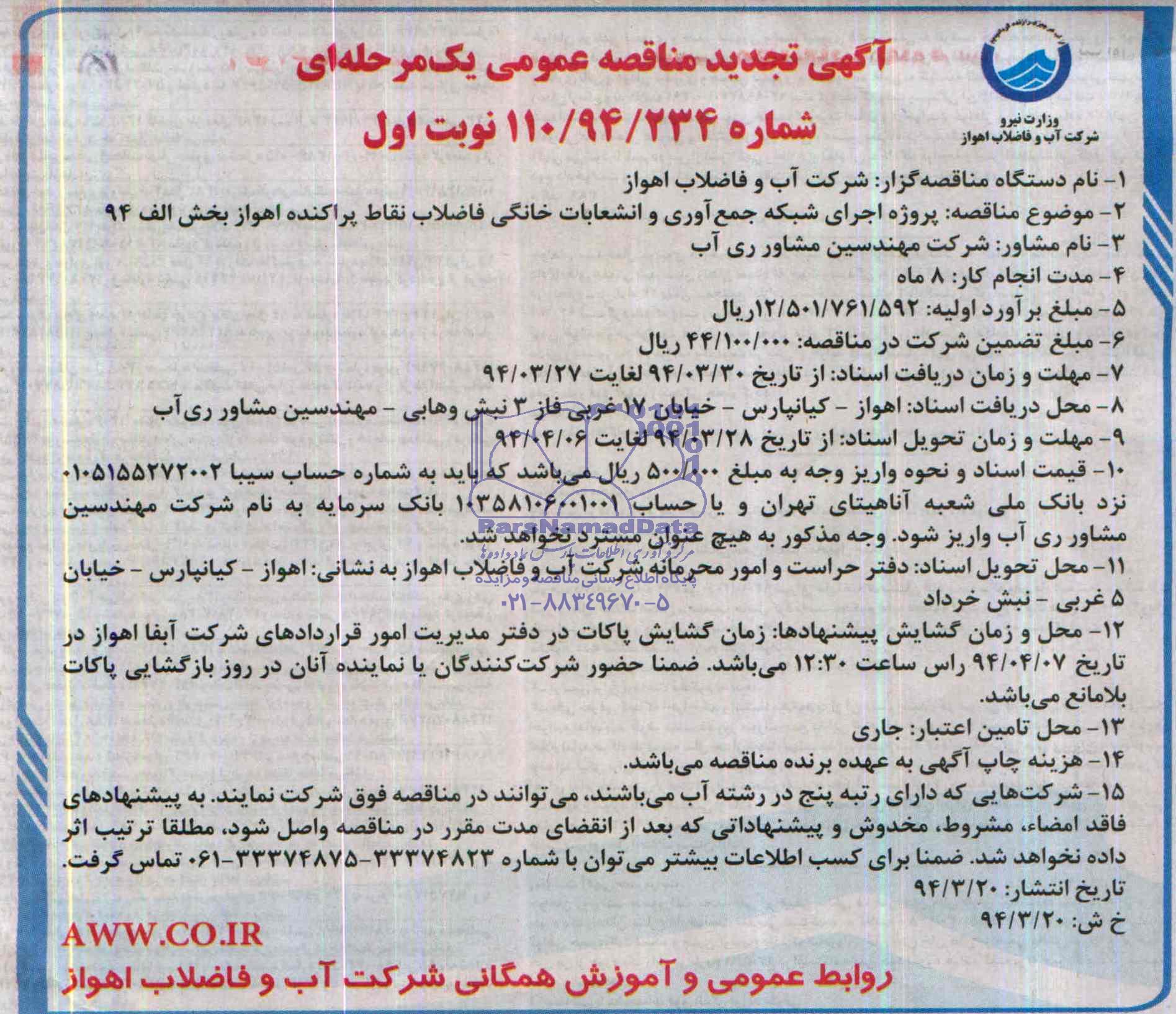 موضوع مناقصه: پروژه اجرای شبکه جمع آوری فاضلاب و انشعابات خانگی فاضلاب نقاط پراکنده اهواز بخش الف 94