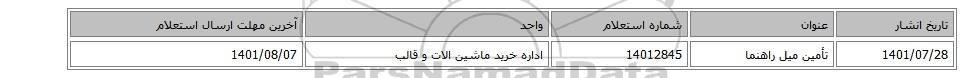 | 1401/07/28 | تأمین میل راهنما | 14012845 | اداره خرید ماشین الات و قالب | 1401/08/07 |