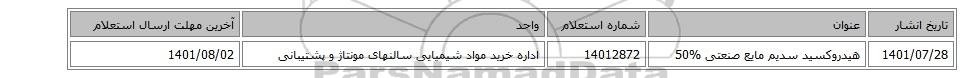| 1401/07/28 | هیدروکسید سدیم مایع صنعتی 50% | 14012872 | اداره خرید مواد شیمیایی سالنهای مونتاژ و پشتیبانی | 1401/08/02 |