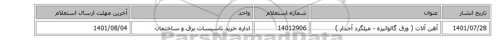 1401/07/28آهن آلات ( ورق گالوانیزه - میلگرد آجدار ‏)14012906اداره خرید تاسیسات برق و ساختمان1401/08/04