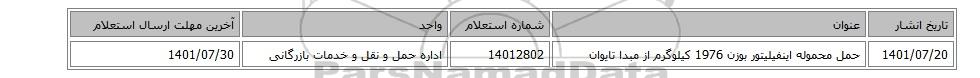 | 1401/07/20 | حمل محموله اینفیلیتور بوزن 1976 کیلوگرم از مبدا تایوان | 14012802 | اداره حمل و نقل و خدمات بازرگانی | 1401/07/30 |