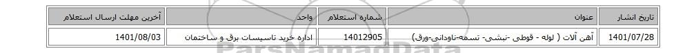 | 1401/07/28 | آهن آلات ( لوله - قوطی -نبشی- تسمه-ناودانی-ورق) | 14012905 | اداره خرید تاسیسات برق و ساختمان | 1401/08/03 |