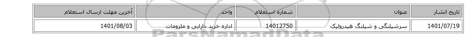 | 1401/07/19 | سرشیلنگی و شیلنگ هیدرولیک | 14012750 | اداره خرید دارایی و ملزومات | 1401/08/03 |