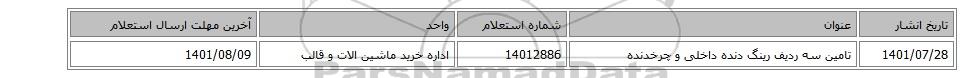 1401/07/28تامین سه ردیف رینگ ‎دنده داخلی و چرخدنده14012886اداره خرید ماشین الات و قالب1401/08/09