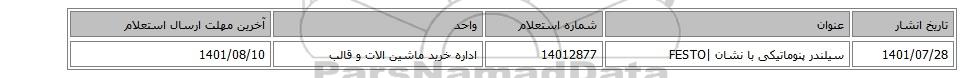 | 1401/07/28 | سیلندر پنوماتیکی با نشان |FESTO | 14012877 | اداره خرید ماشین الات و قالب | 1401/08/10 |