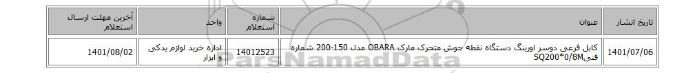 | 1401/07/06 | کابل فرعی دوسر اورینگ دستگاه نقطه جوش متحرک مارک OBARA مدل 150-200 شماره فنیSQ200*0/8M | 14012523 | اداره خرید لوازم یدکی و ابزار | 1401/08/02 |